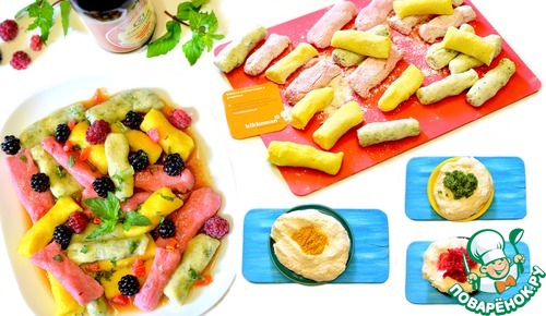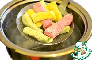 Из творожного теста сформовать разноцветные колбаски, нарезать брусочками.