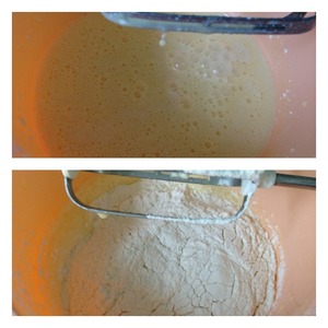 Влить молоко и перемешать. Добавить разрыхлитель и муку, взбить. Тесто как густая сметана