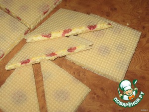 Разрезаем сначала на квадратики, потом делим их на треугольники. Делать нужно быстро, чтобы вафля не размокла, поэтому сразу много не намазывать начинкой.