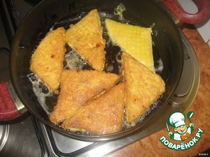 Обмакиваем в взбитом яйце и жарим на растительном масле до зарумянивания с двух сторон.