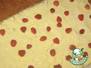 Корж кладём на поверхность, смазываем приготовленной творожной массой, посыпаем земляникой (можно использовать любые ягодки или кусочки фруктов по усмотрению, а также сухофрукты распаренные, только все мелко нарезаем, земляничка была маленькая, поэтому использовала целиком).