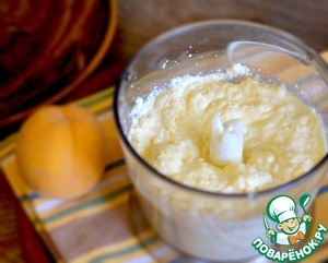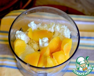 Соедините в чаше блендера творог, сахар и нарезанный персик.
