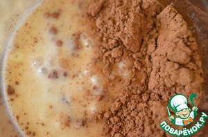 Добавьте растительное масло, молоко, какао и муку. Взбить до однородной массы. Выпекать на сковороде, как обычные блины.