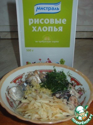 Приготовить начинку: Для этого консервы вместе с жидкостью смешать с рисовыми хлопьями, зеленью и яблоками натертыми на крупной терке без кожуры.