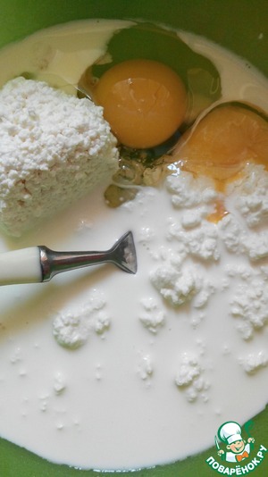 Творог растираем с яйцами, солью, перцем, чесноком и сливками (можете использовать вместо сливок молоко)