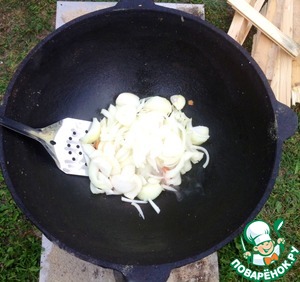 В растопленный жир добавить нарезаный лук и готовить до его прозрачности. Приблизительно мин.10
