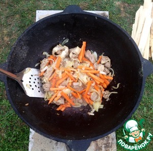 После чего положить в казан нарезанную морковь, желательно тонкими полосками. Обжаривать на жиру с мясом и луком еще мин.10, Прермешивая.