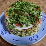 Начинаем формировать наш тортик: кабачковый блин смазать первой творожной начинкой.