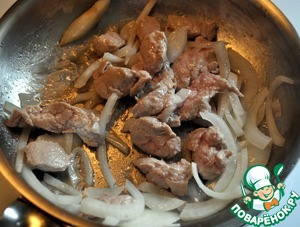 Обжариваем мелко нарезанное мясо с луком 5 минут