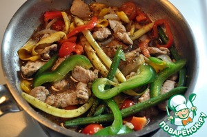 Добавляем порезанную овощную смесь к мясу и заливаем соусом. Закрыть крышкой и томить 10 - 15мин, или поставить в духовку на 10 мин.