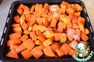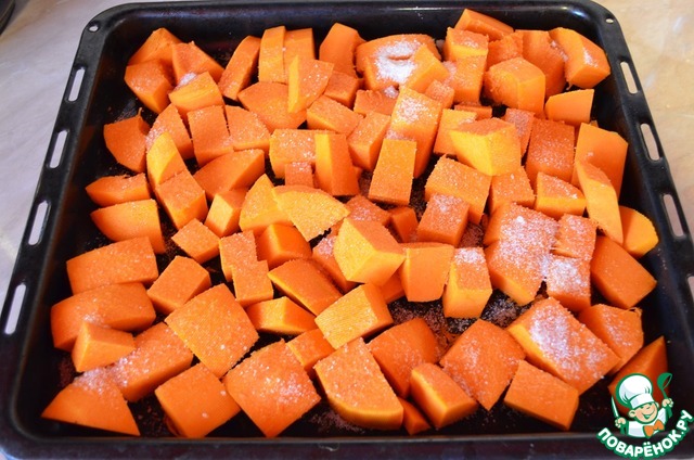 Выложим тыкву на противень, посыпаем сахаром. И запекаем 45 минут при 180 градусах в духовом шкафу.