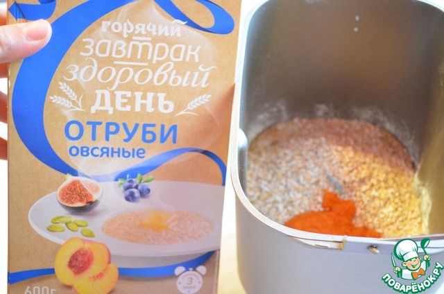 Добавьте в чашу хлебопечи муку, отруби овсяные от ТМ «Мистраль», растительное масло, тыквенное пюре. Замешивать тесто на режиме «Основной замес теста».