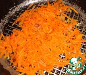 Для начала приготовим начинку. Для этого необходимо измельчить репчатый лук и обжарить на растительном масле 2-3 минуты. Затем добавить натертую на крупной терке морковь. Тушим 5 минут.