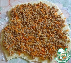 Выкладываем начинку по поверхности пласта и сворачиваем в рулет.