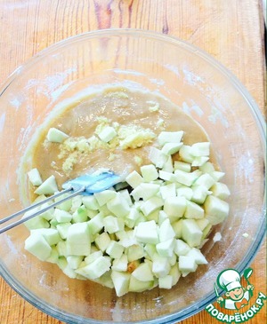 Добавляем к яично-масляной смеси муку с пряностями, разрыхлитель, соду, имбирь и яблоки. Все хорошо перемешиваем.