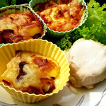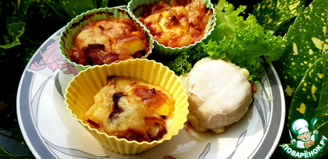 Куриное филе нарезать на порционные кусочки, отбить, посолить. Формочки для кексов застелить фольгой, смазать маслом, выложить куриное филе, слегка придавить края и выложить овощной фарш. У меня формочки силиконовые, поэтому обошлась без фольги.