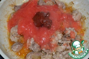 Либо томатную пасту разводим водой и добавляем в сковороду плюс стакан воды или бульона.
