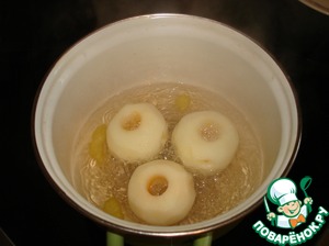 Яблоки очистить от кожуры, удалить сердцевину и припустить в кипящем сиропе.