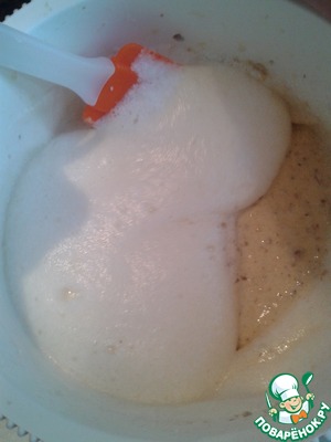Белки взбиваем в тугую пену, добавляем в тесто и аккуратно перемешиваем