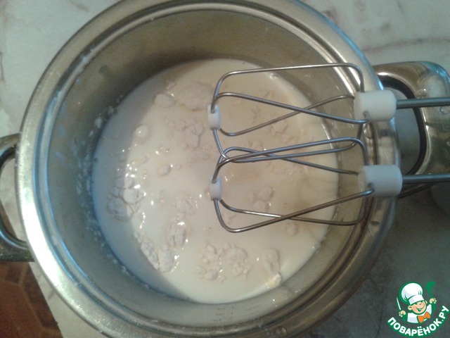 В это время готовим крем: муку, молоко и сахар взбиваем миксером, ставим на огонь и доводим до кипения