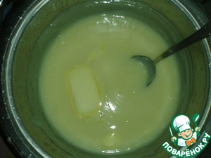 Выключаем, кладём в крем сливочное масло и помешиваем до полного его растворения