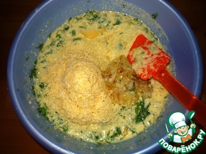 Смешиваем вместе слегка взбитые яйца, муку, натертый сыр, зелень (у меня укроп и петрушка), измельченный чеснок, сметану. Добавляем соль и свежемолотый перец по вкусу.