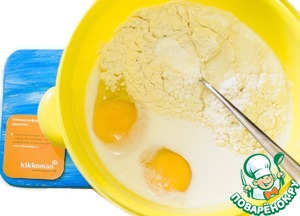 Взбить миксером яйца с сахаром, добавить молоко, ванильный сахар, муку и разрыхлитель, ещё раз взбить. -