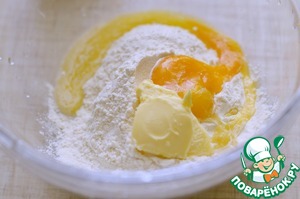 2. В просеянную муку добавить желток и сливочное масло, перемешать.