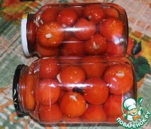 Почему сюрприз? А потому что внутри каждой помидорки, прячется, зубчик чеснока. Получаются очень вкусные помидорки в сладко-кислом маринаде.