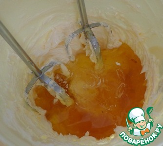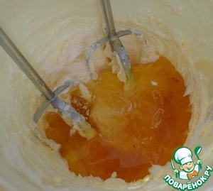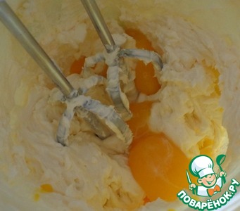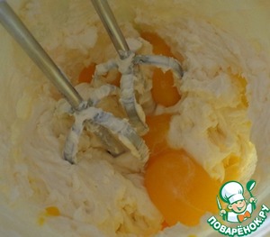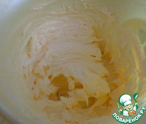 Желтки отделяем от белков. Белки взбиваем в крепкую пену. Желтки добавляем к маслу и взбиваем еще 1-2 минуты.