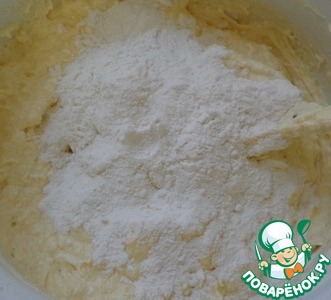 Муку смешиваем с разрыхлителем теста и ванилином, добавляем к тесту. Хорошо перемешать до однородного состояния.