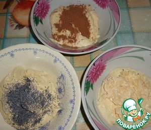 Тесто необходимо разделить на 3 части: в первую - кладем мак и отруби; во вторую - какао; в третью - рисовые хлопья. Хорошо перемешать.