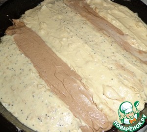 Форму для выпечки смазать растительным маслом. Тесто выкладываем полосками, чередуя их. Сначала маково-отрубное тесто, затем темное и светлое с рисовыми хлопьями. Расположение полосок можно менять по своему усмотрению.