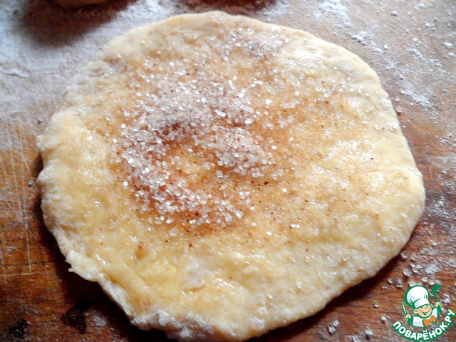Каждый шарик раскатываем в тонкий блинчик, смазываем растительным маслом и посыпаем смесью из сахара и корицы.