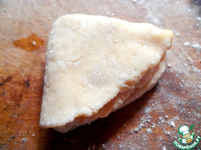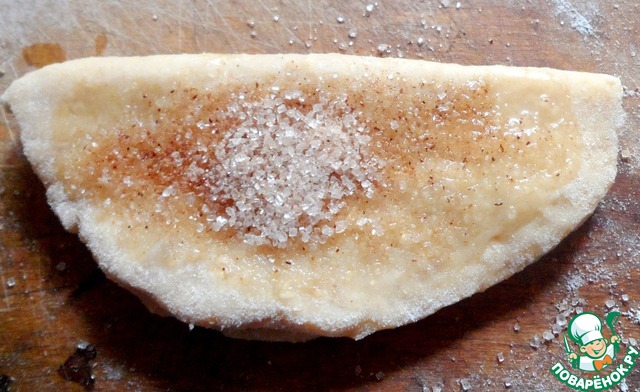 Складываем лепешечку пополам и одну сторону опять смазываем растительным маслом и посыпаем сахарно-коричной смесью.