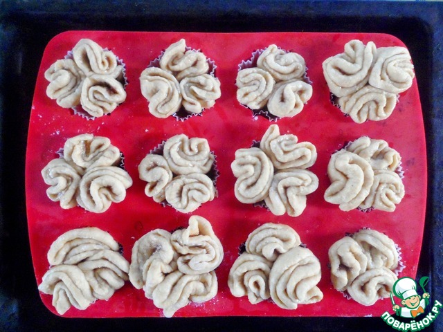 В формочки для кекса положить бумажные формочки и каждый заполнить тремя четвертинками коричного теста, формируя бутон цветка. Можно по желанию в складочки теста воткнуть дольки яблока, это придаст булочкам дополнительный аромат и вкус.