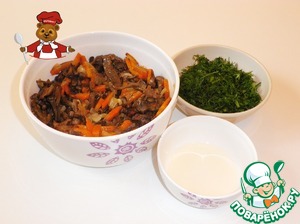 2. Обжарьте на подсолнечном масле лук, морковку, отварные грибы, соль и специи. Готовьте помешивая, чтобы грибы подрумянились.