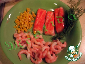 Эдакий мой вариант яиц Фаберже:).. креветки, крабовые палочки, кукуруза, укроп, перец стручковый сладкий.. вкусно.. просто и красиво