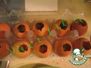 Собрать скорлупки от яиц, проделывая с одного конца небольшие дырочки и через них выливая содержимое. Затем скорлупки промыть под проточной водой и обсушить в форме для яиц.