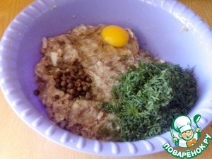 Затем добавить половину мелко порубленной зелени, яйцо, горошины душистого перца, перемешать.