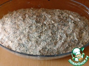 В сливки добавить панировочные сухари, горчицу, тертый сыр и оставшуюся рубленую зелень. Перемешать.