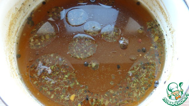 В кипящую воду добавить специи, соль, перцы - прокипятить 2 минуты, остудить до комнатной температуры, добавить масло;