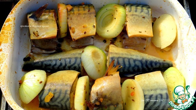 Порезать скумбрию на крупные кусочки, лук - кольцами;
