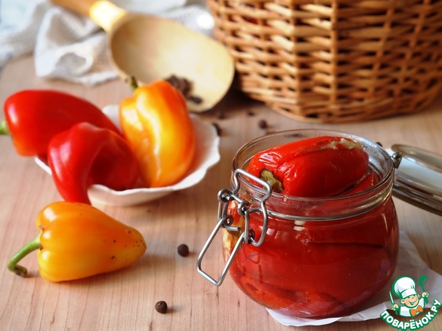 Рецепт с итальянскими корнями только не с острыми мини-перцами а с обычными болгарскими маленькими перчиками. Самые маленькие что я нашла были размером с мизинец, на два укуса. Идеальная закуска к вину. Хранится в холодильнике до месяца.