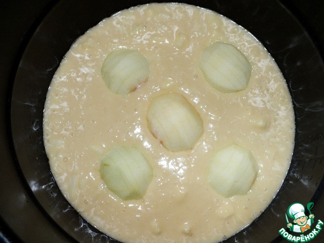 Тесто выложить в смазанную чашу мультиварки. Сверху для красоты я выложила дольки яблок. Печь на режиме "Выпечка" - 40 минут (ориентируйтесь на мощность своей мультиварки).