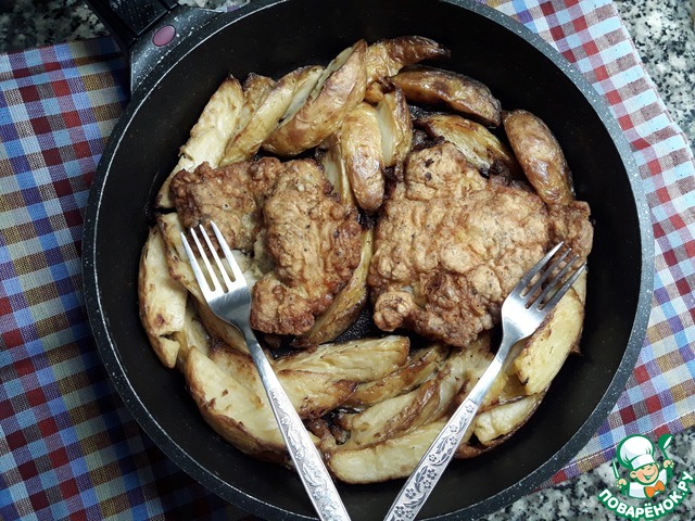 Хорошо обмакнуть во взбитом яйце. Обжарить на растительном масле без запаха с обеих сторон, добавить картофель, уменьшить огонь и обжаривать до румяной корочки минут 5-7. Разогреть духовку до 190*, поставить сковородку в духовку и довести до готовности еще минут 10. Но можно довести до готовности и в сковороде, накрыв крышкой и уменьшить огонь до минимума.
