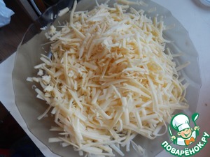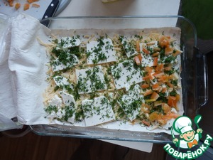 Выкладываем часть тертого сыра (здесь нужно посчитать сколько получится слоев лаваша на форму и разделить сыр на порции) и часть сыра Фета (я нарезаю сразу в форму тонкими пластинками).