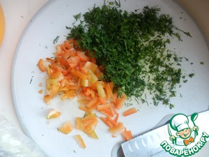 Рулет собирается минут за пять, остальное время он готовится в духовке. Определенно придется по вкусу любителям солененького. Прелесть рулета еще и в том, что угодить можно каждому члену семьи, условно разделив рулет на зоны. Таким образом, у меня был солененький рулет с укропом, а у мамы с болгарским перцем.