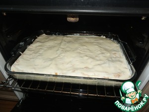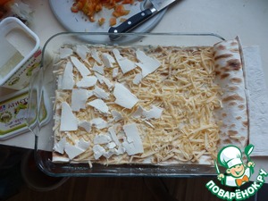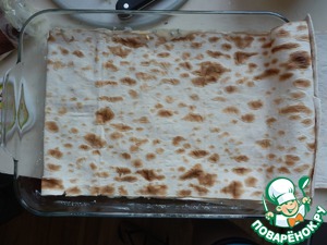 Смазываем форму и выкладываем первый слой лаваша (его можно порезать по размеру формы или использовать одним листом).
