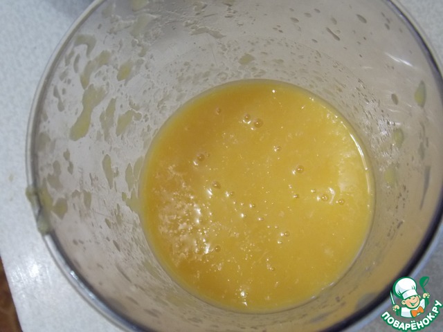Пока наша творожная основа стоит, займемся мандариновым слоем. Для этого очистим мандаринки и удалим если есть семечки. Разделить на дольки, положить сахар и крахмал. Все взбить хорошенько блендером.